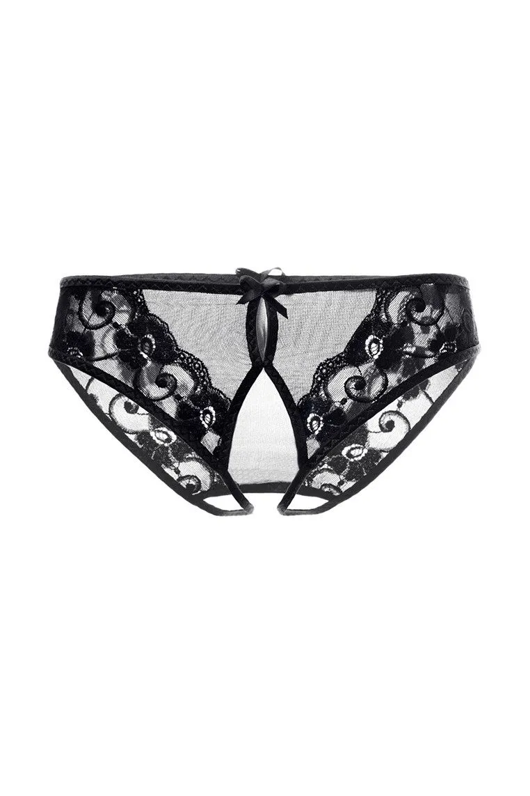 Эротические трусики Erolanta Pauline из стрейч-сетки, эластичные, с декоративным вырезом, с кружевными вставками, с атласным бантиком спереди.