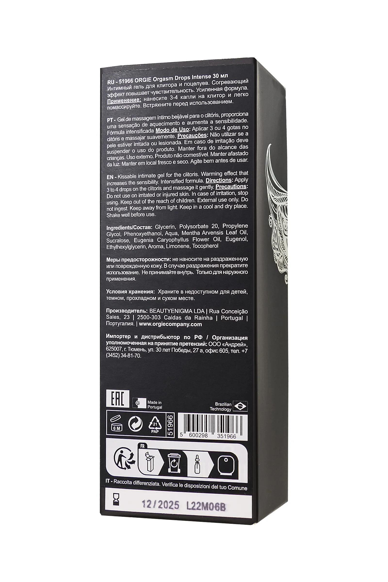 Экстремально возбуждающие капли для клитора Orgasm Drops Intense открывают мир интенсивных ощущений! Orgasm Drops Intense - усиленная формула, созданная специально для повышения ощущения тепла и чувствительности клитора. Экстремальная стимуляция клитора погружает в усиленное согревание и увеличивает чувствительность клитора на максимум. Ощущения, которые вы испытаете, приведут вас к невероятному возбуждению и ярким оргазмам. Подарите себе сладкое удовольствие с ярким вкусом красного яблока, который сделан с новой формулой без следов гвоздики, чтобы вы могли наслаждаться каждой каплей. Как использовать капли Orgasm Drops Intense? Просто нанесите 2 или 3 капли непосредственно на клитор, проведите нежный массаж и дайте несколько минут волшебству раскрыться. Легкое охлаждение вначале, затем интенсивное согревание. При оральных ласках ощущения становятся еще более многогранными. Для более деликатного воздействия не превышайте дозировку - 1 капля. Orgie уважает ваши чувства и комфорт, и поэтому рекомендует начинать знакомство с продуктом с одной капли. Роскошный стеклянный флакон с капельницей позволяет контролировать расход средства. Объем 30 мл рассчитан приблизительно на 150 доз.