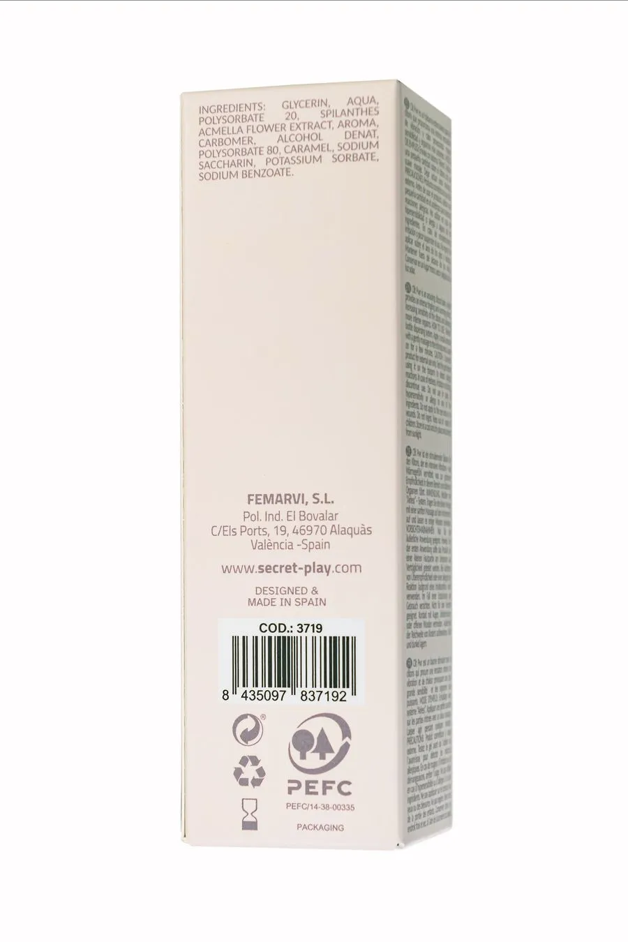 глицерин, вода, полисорбат 20, экстракт цветов Spilanthes Acmella, ароматизатор, карбомер, денатурированный спирт, полисорбат 80, сахарин натрия, сорбат калия, бензоат натрия, CI 14720.