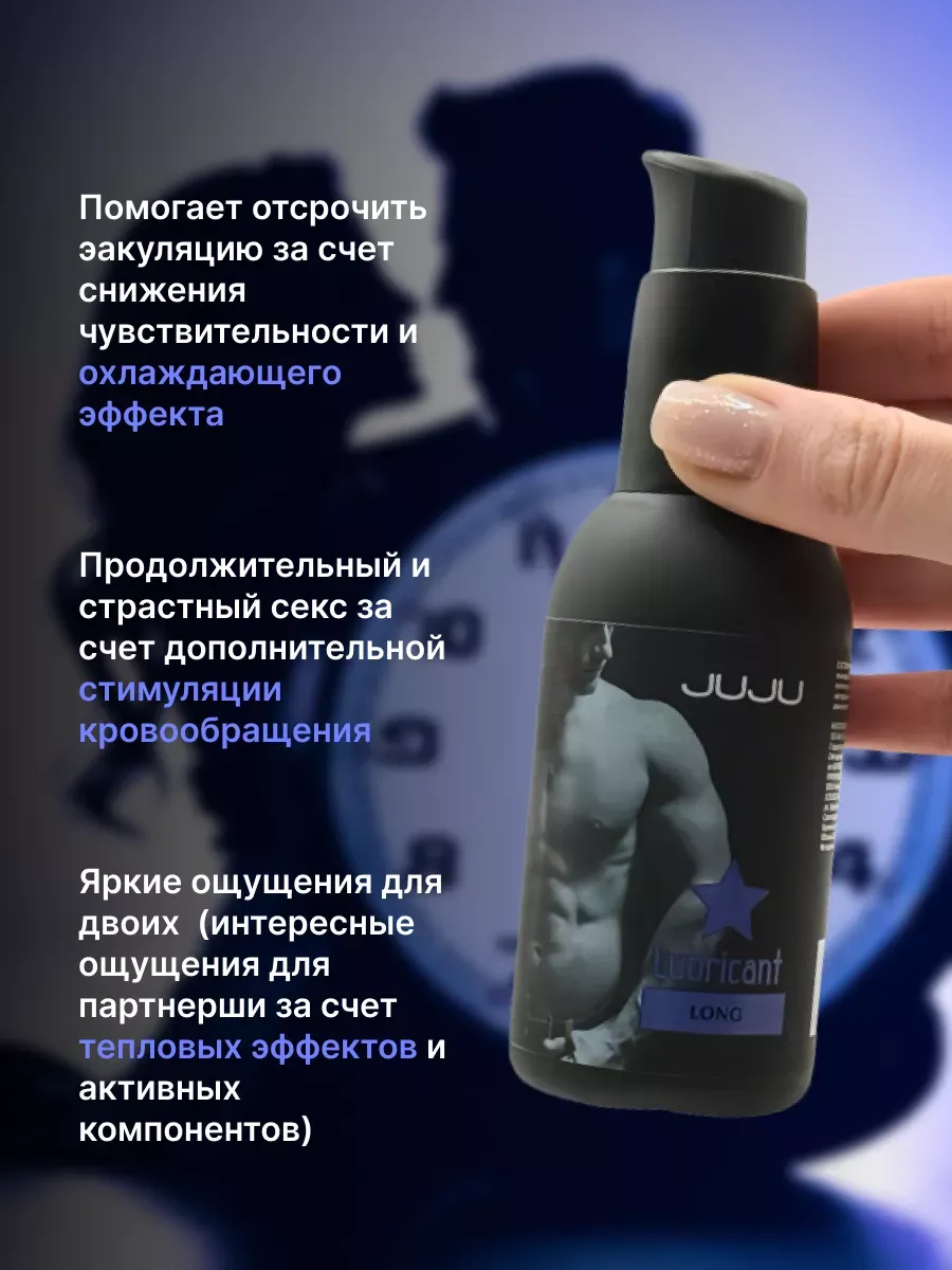 Сделать любовный акт необычно продолжительным и по-настоящему приятным, страстным сексуальным партнерам поможет пролонгирующий лубрикант JUJU Long. Мягкое успокаивающее (и даже заживляющее) воздействие осуществляется благодаря уникальному составу смазки: охлаждающему ментиллактату и устраняющим болезненные ощущения экстракту ромашки, пантенолу. Чудесно подходит для использования с презервативами. Легко удаляется с тела с помощью мыльной воды. Дарит просто превосходные – чувственные и нежные – фрикции. Состав: вода очищенная, глицерин, ПЭГ-40 гидрогенизированное касторовое масло, метилпарабен,этилпарабен в пропиленгликоле, экстракт ромашки, гидроксиэтилцеллюлоза, пантенол,метиллактат, лимонная кислота, сополимер акрилатов, триэтаноламин, ЭДТА.  Срок годности- 3 года.