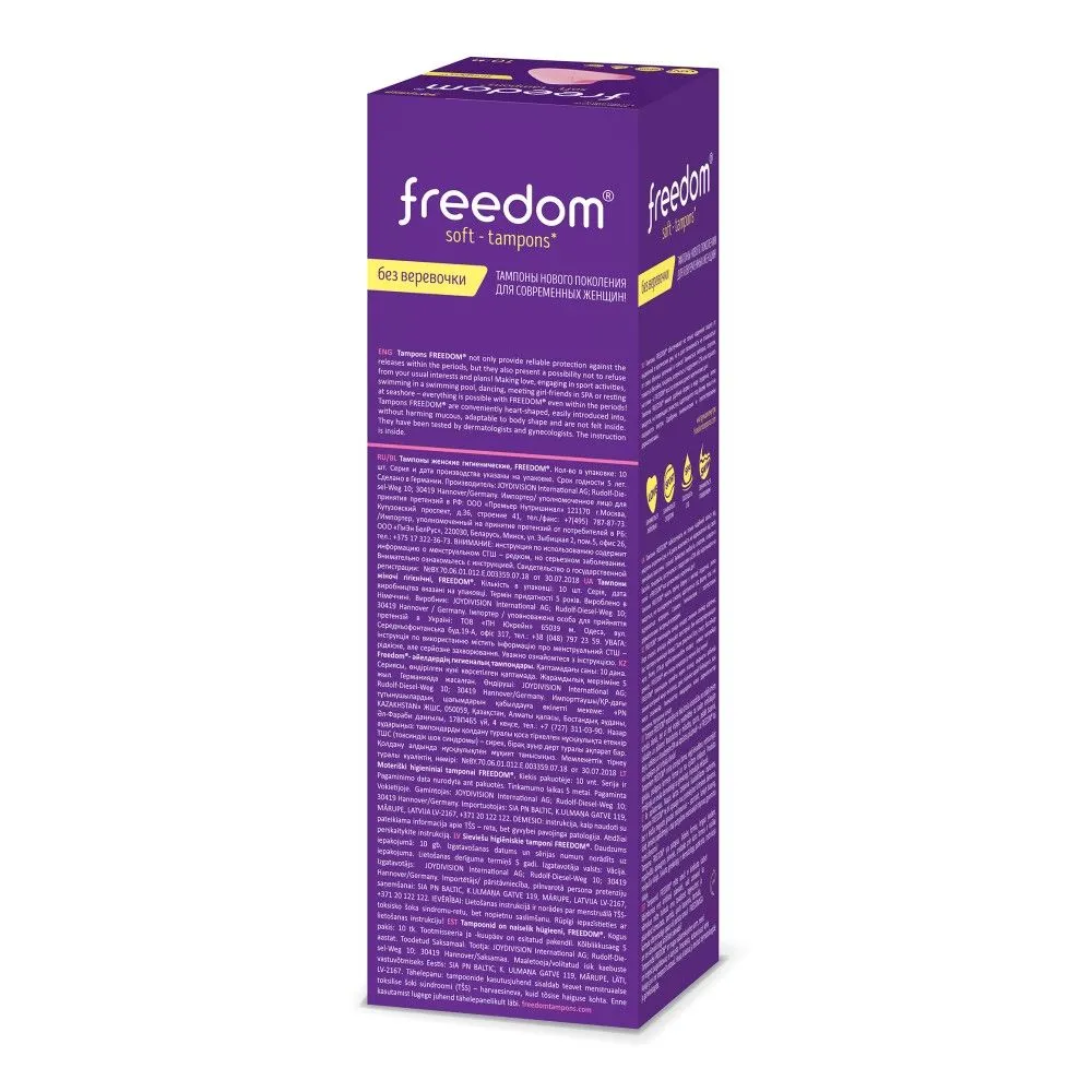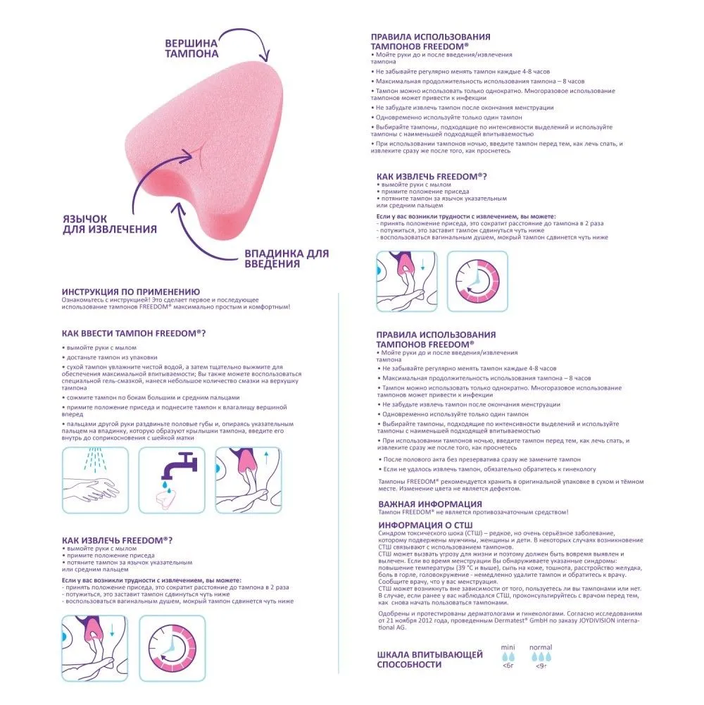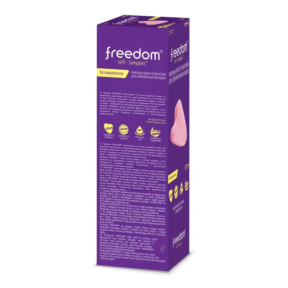 100% безопасный медицинский материал, разработанный для тампонов Фридом экспертным советом в Германии, не пересушивает слизистую и не травмирует ткани при введении и извлечении. Материал тампонов FREEDOM не увеличивается в размерах при впитывании. Вот прочему FREEDOM - это комфортные тампоны для секса и спорта, купания и активного образа жизни. Купание с тампоном, тренировки, фитнес и даже секс с тампоном – теперь ничто не помешает!