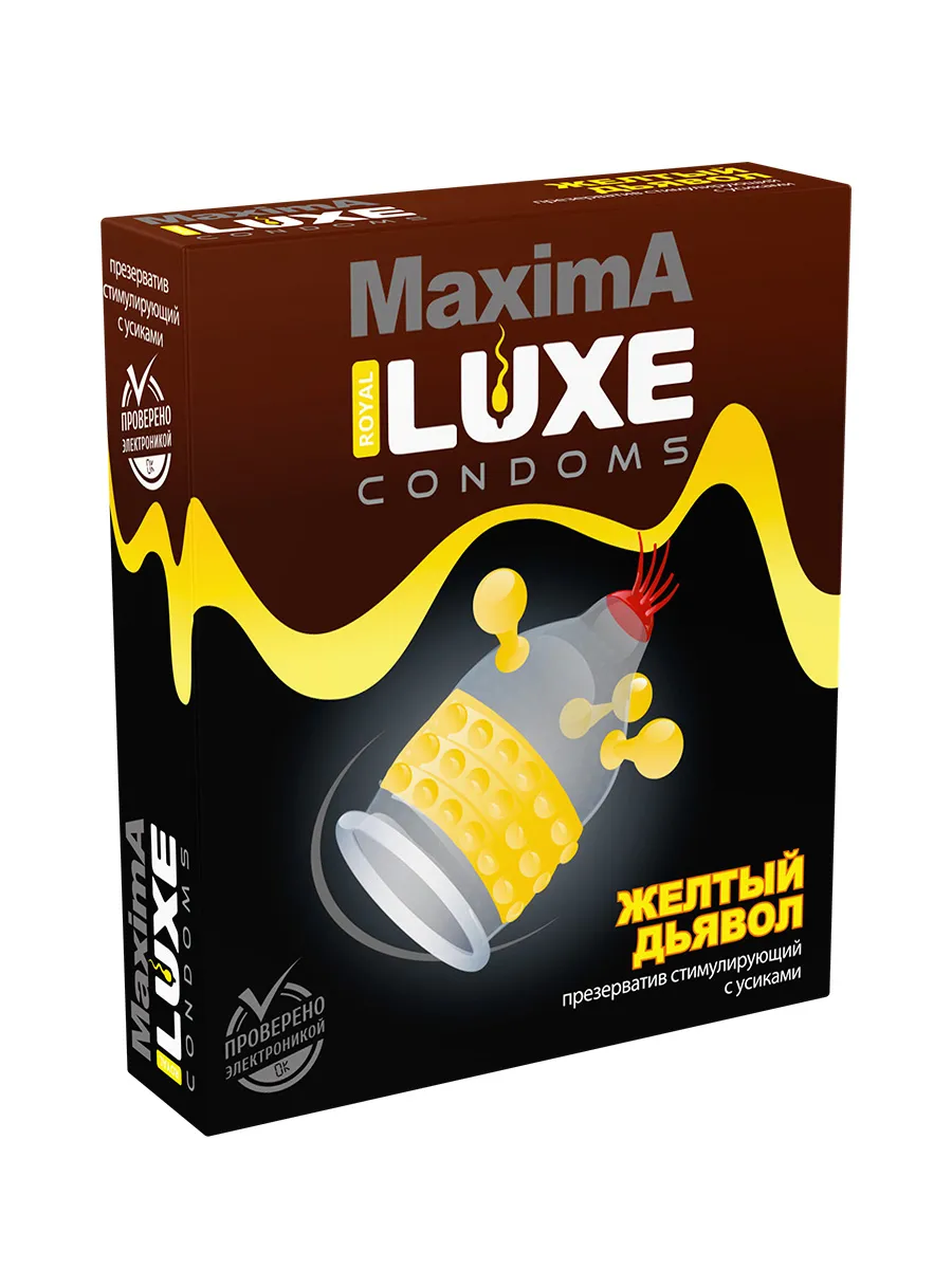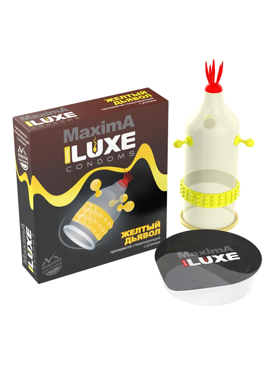 Желтый дьявол - это латексный презерватив из линейки Maxima компании Luxe, снабженный силиконовой смазкой. Он будет отлично стимулировать обоих партнеров своими увеличенными пупырышками и скруглёнными усиками. Благодаря этому Вы и Ваша партнерша сможете достигнуть запредельного экстаза намного быстрее. Также этот презерватив подойдёт в качестве дополнения для секс-игрушки.