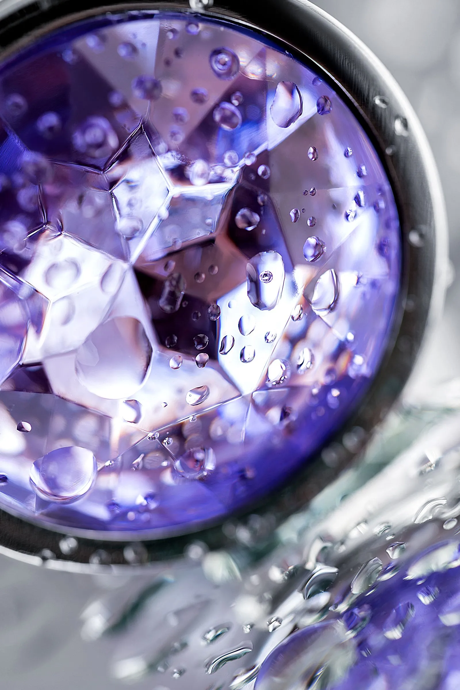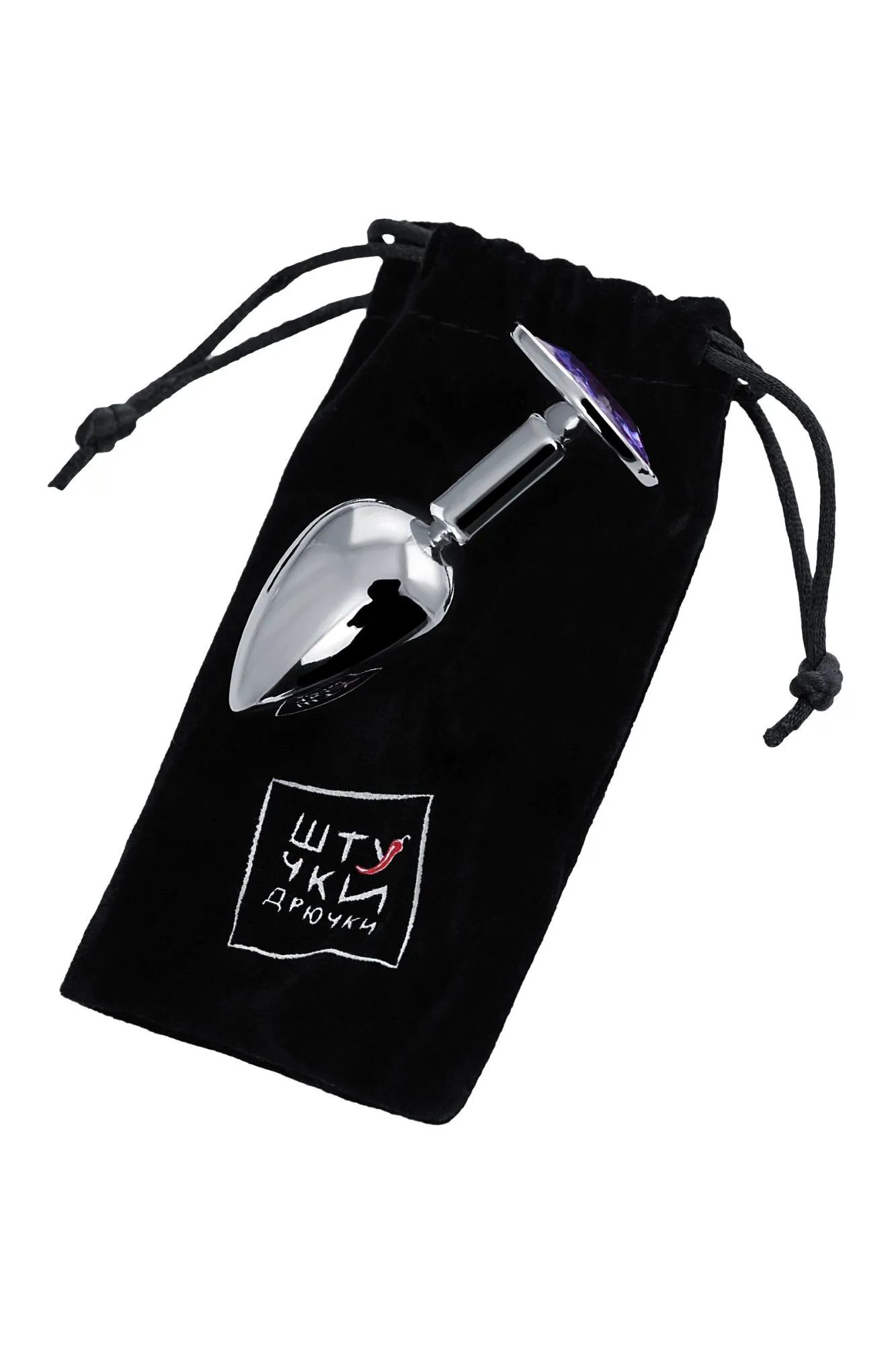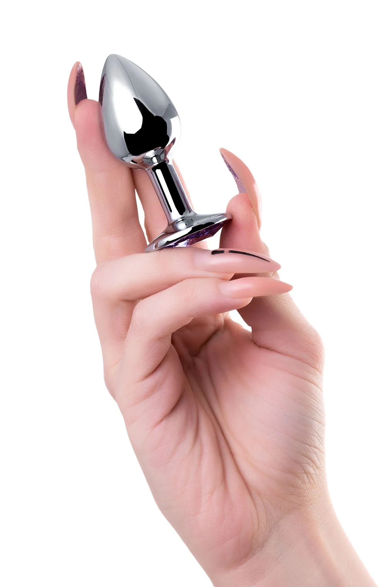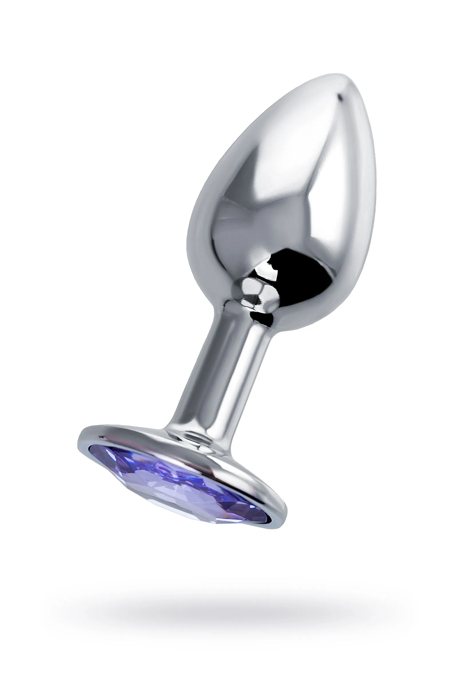 —Анальная втулка Штучки-дрючки, металл, серебряная, с фиолетовым кристаллом, 7 см, Ø 2,8 см, 50 г