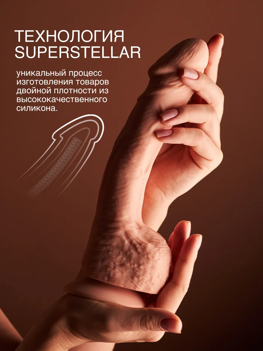 Технология Superstellar – самая современная и сложная технология изготовления реалистичных фаллоимитаторов, состоящая из более чем 6 этапов. Дилдо ручной работы имеет несколько слоев плотности, что делает игрушку невероятно реалистичной. На резиновом члене нет швов.
