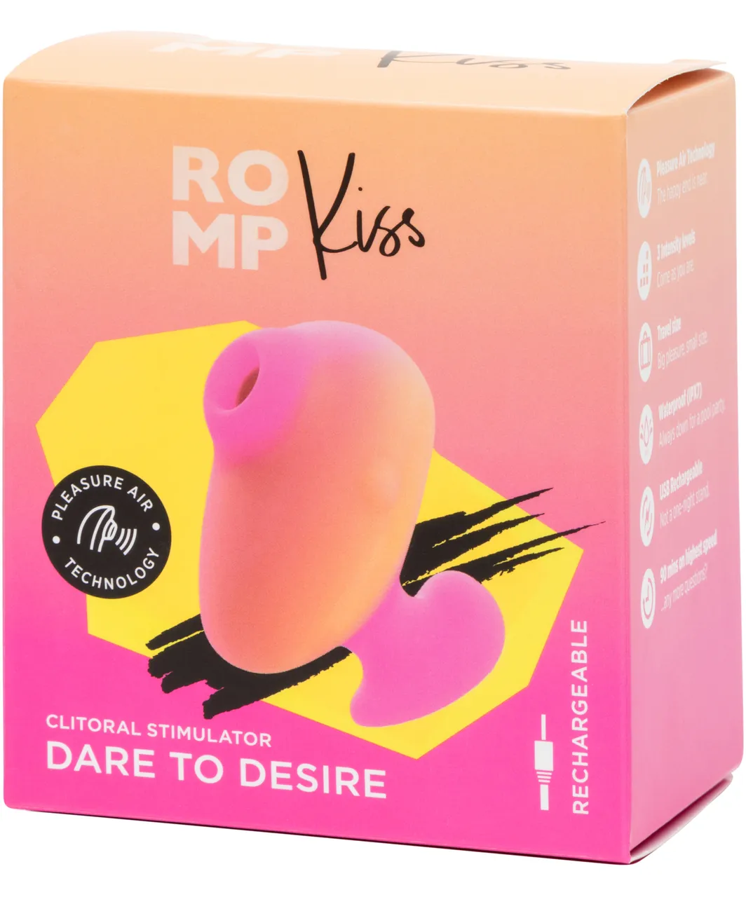 Испытайте уникальную технологию дразнящего посасывания Pleasure Air вместе с компактным ROMP Kiss. Оригинальный и эргономичный дизайн устройства создан для комфорта и удобства. Расположите Kiss между двумя пальцами и плотно прижмите игрушку к коже. Такой удобный захват гарантирует полный контроль действий и ощущений.