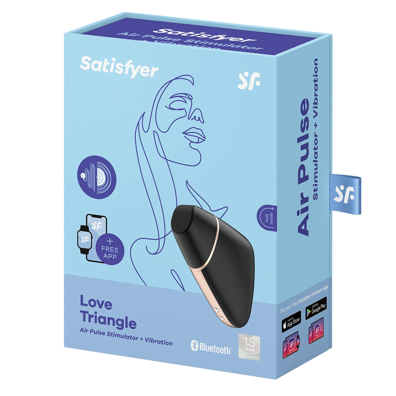 SВакуумный вибромассажер Satisfyer Love Triangle сочетает в себе функции вибратора и вакуумного стимулятора. Имеет 10 режимов вибрации и 11 режимов вакуумной стимуляции, которые могут работать как вместе, так и раздельно. Работает от аккумулятора, и заряжается от магнитного зарядного устройства (идет в комплекте). Вакуумный стимулятор оснащен системой Bluetooth, и управление может осуществляться через бесплатное мобильное приложение Satisfyer, либо кнопками на устройстве. Общая длина стимулятора составляет 10 см. Внутренний диаметр насадки- 1,5 см. Водонепроницаемый, соответствует международным стандартам IPX7.