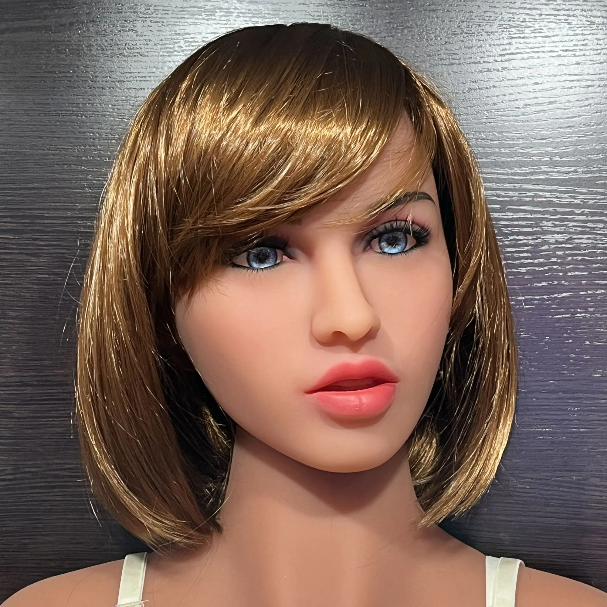 Эта реалистичная секс-кукла, выполненная в полный рост, практически неотличима от настоящей девушки благодаря своим пропорциям, манящим изгибам тела, весу и невероятно нежному материалу. У нее очень выразительное лицо с голубыми глазами, игриво приоткрытым ротиком и аккуратным носом. С ней будет возможно исполнить все свои самые тайные фантазии, а она, в свою очередь, никогда не откажет. Куклу можно наряжать в самые откровенные наряды и менять цвет волос при помощи париков, создавая из нее идеальную для себя любовницу, согласную на все.