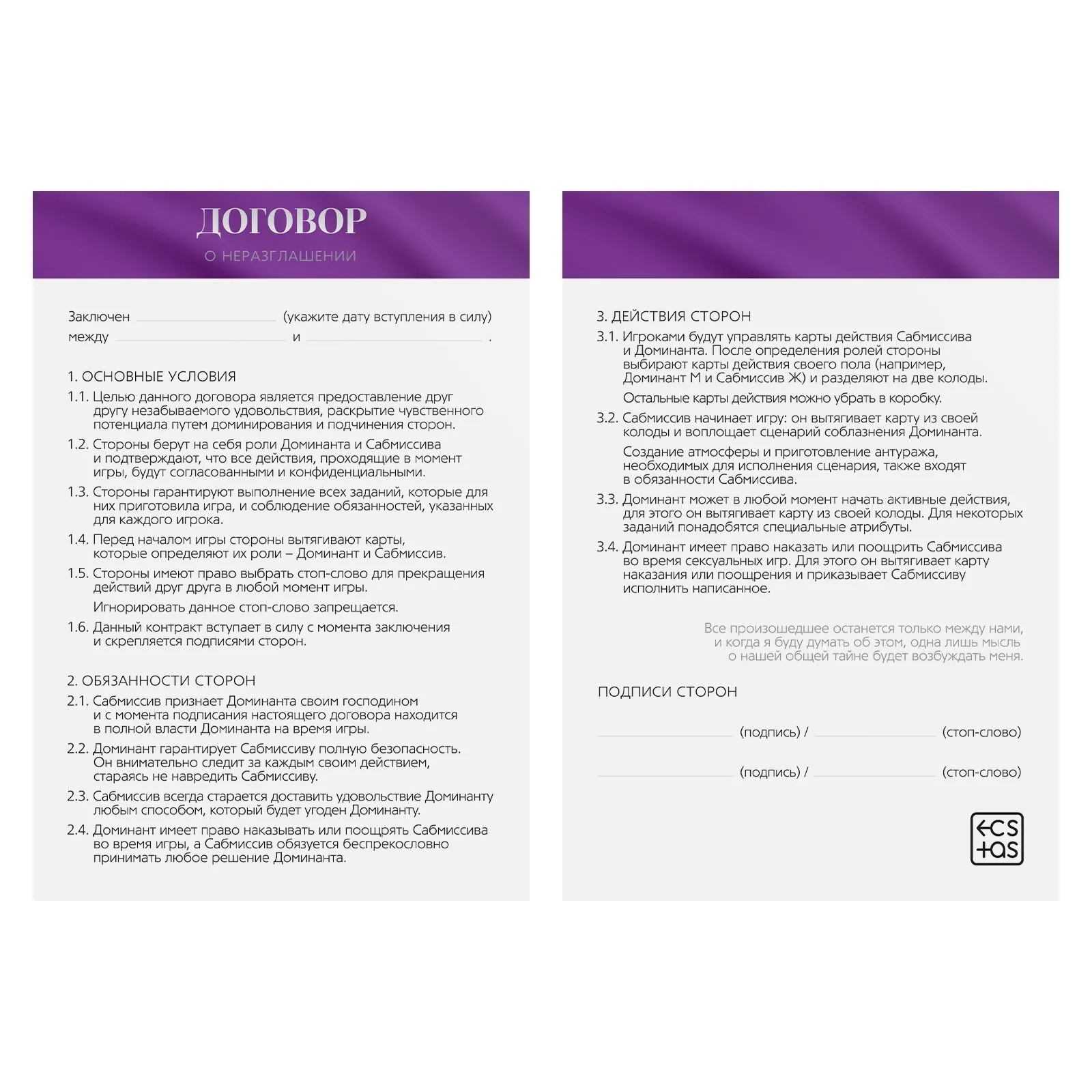 Хотите испытать новые эмоции? С этой игрой наказания будут более возбуждающими, а карты ролей помогут создать интригующую атмосферу. Вам нужно лишь расслабиться и полностью погрузиться в процесс. Подпишите договор о неразглашении и выберите желаемую роль. Один из вас будет доминирующим (доминантом), а другой — подчиняющимся (сабмиссивом). В комплекте есть карты наказаний для подчиняющегося, который ослушался своего хозяина. Доминирующий в любом порядке вытягивает карты из колоды наказания и следует инструкциям.