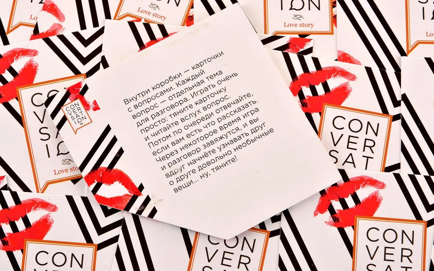 Игра "Конверсейшн. Любовное настроение" состоит из 149 карточек с вопросами для интересной беседы и поможет Вам лучше узнать своего друга или вторую половинку. Вам попадутся как простые вопросы, так и более сложные, ответ на которые нужно будет обдумать и задуматься об отношении к семье, детям, любви или деньгам. Поочередно вытягивая карточки и слушая ответы, Вы сможете