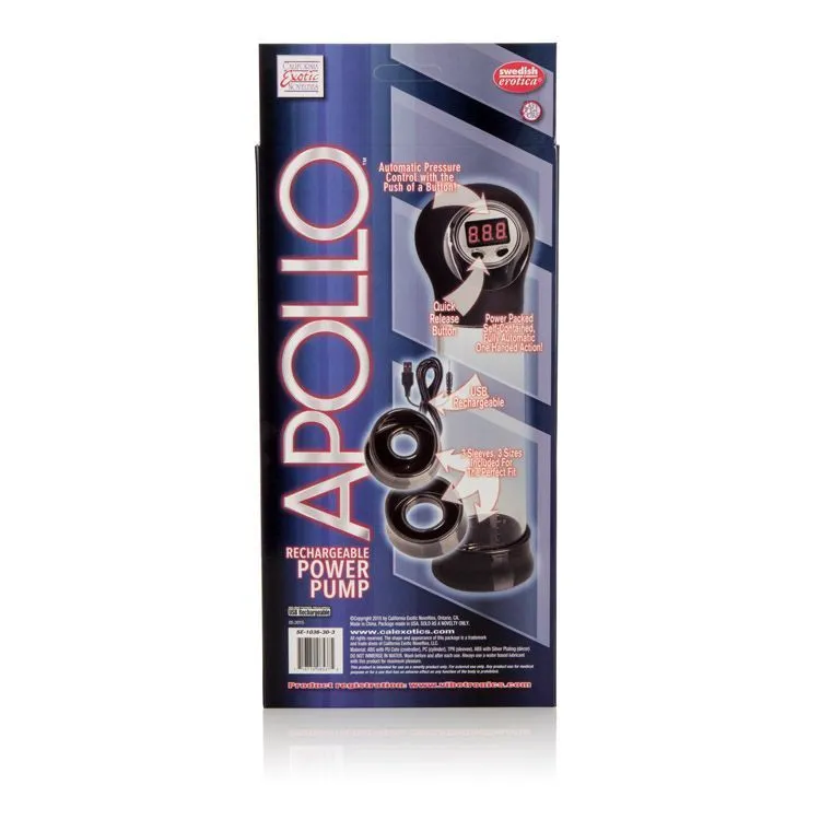 Apollo Rechargeable Power Pump - это автоматическая вакуумная помпа с перезаряжаемым аккумулятором для мужчин. Она проста в использовании, ведь контроль давления управляется одной рукой с помощью кнопок, а при малейшем дискомфорте Вы всегда сможете быстро сбросить воздух. Помпа оснащена легко читаемым LED-дисплеем, на котором будет легко отслеживать уровень давления внутри цилиндра. На самом цилиндре есть шкала измерений, благодаря которой Вы сможете отмечать достигнутый результат. В комплекте с помпой идут три насадки разного диаметра (кольца для уплотнения), которые изготовлены из термопластичной резины.