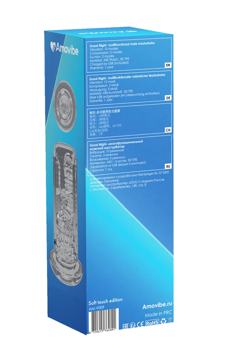 Good night- невероятный мастурбатор, который максимально точно имитирует оральный секс. Игрушка имеет 10 режимов бесшумной вибрации, а также три режима всасывания и три режима сжатия. Все режимы могут работать как вместе, так и по отдельности. Кроме того, игрушка оснащена функцией «мгновенного оргазма» включает всасывание и вибрацию на максимальные частоты нажатием всего одной кнопки. Функция сжатия при этом так же работает, на среднем режиме, не блокируя всасывание, для более острых и приятных ощущений.