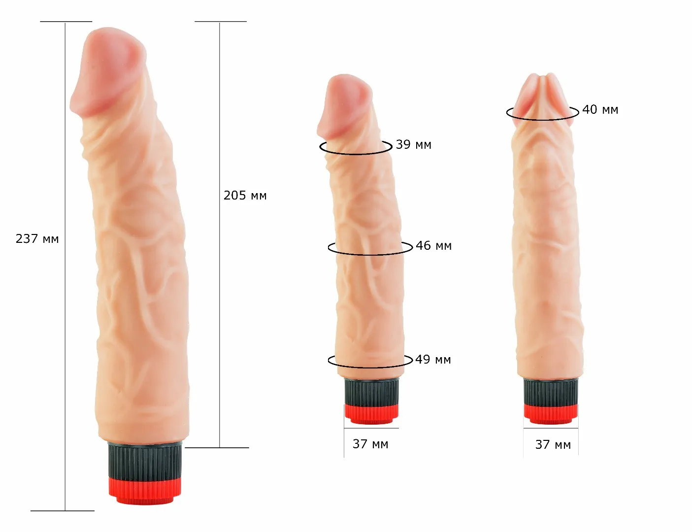 Вибромассажёр телесного цвета. Имеет форму члена с ярко-выраженной головкой. Необычайно приятный, рельефный, выполненный из материала «Неоскин» , передающий эффект мягкой реалистичной текстуры кожи, не имеет швов. Виброэлемент расположен по всей длине изделия. Степень вибрации регулируется при помощи кнопки, расположенной в основании. Работает от 2АА батареек (нет в комплекте). Общая длина – 24 см, рабочая длина- 20,5 см, максимальный диаметр - 4,2 см. Упаковка: картонная коробка с принтом.