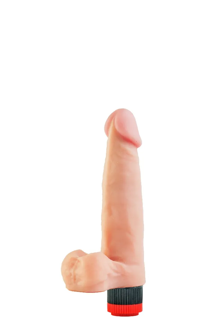 Вибратор-реалистик телесного цвета. Имеет форму члена с ярко-выраженной головкой и мошонкой, рельефный, выполненный из материала неоскин, не имеет швов. Скорость вибрации регулируется кнопкой у основания изделия. Характеристика: работает от 2АА батареек (нет в комплекте), общая длина – 21,5 см, рабочая длина-15 см, максимальный диаметр- 4,5 см, без запаха, упакован в пленку.