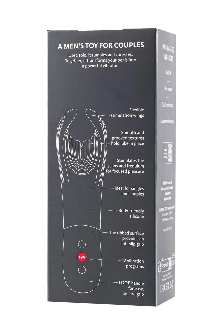 Fun Factory Manta - мужская игрушка для двоих. Выберите удобную позу позволяющую удерживать Manta между вами и оба наслаждайтесь интенсивной вибрацией.Используйте вибратор во время орального секса, дополнительная стимуляция ощущается как глубокий горловой минет с вибрацией! Также Manta идеально подходит для игры соло. Эргономичная форма, гибкие лепестки подстраиваются под любой размер. Бархатистый мягкий и простой в управлении.