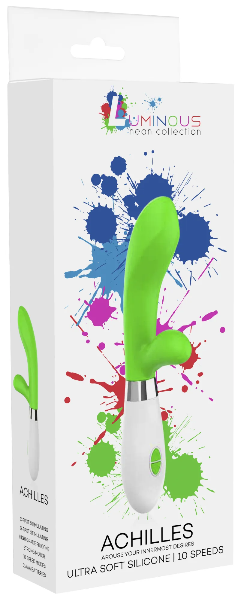 Вибратор-кролик – Achilles имеет округлую утолщённую головку и гибкий клиторальный отросток, что делает стимуляцию более яркой. Вибромассажер имеет два мощных двигателя, по одному в каждом отростке, имеющих 10 функций вибрации, способной достигать на вагинальном стволе до 7000 и на клиторальном отростке до 5200 оборотов в минуту, при этом уровень звука не превышает 60 дБ.