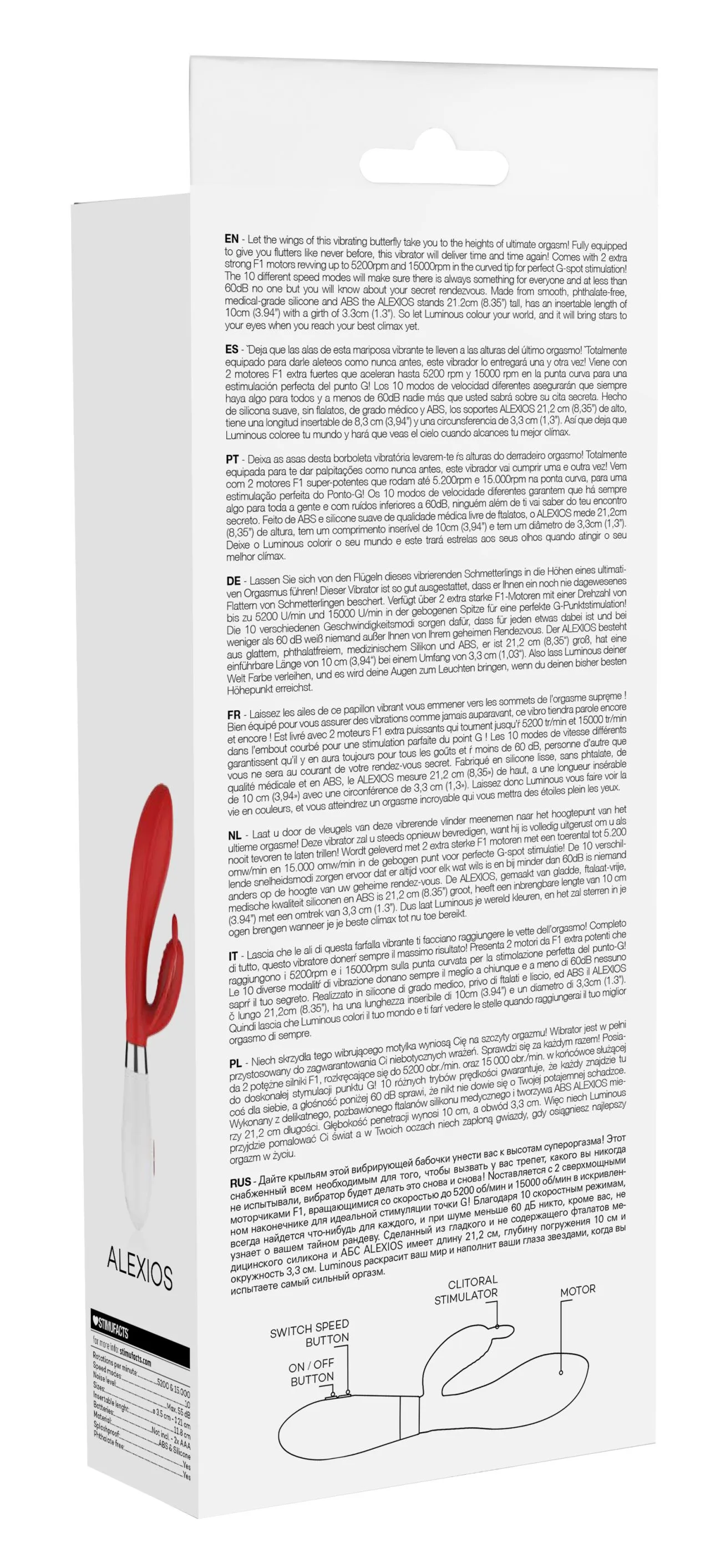 Вибратор - кролик Alexios имеет округлую утолщённую головку и гибкий клиторальный отросток, что делает стимуляцию более яркой. Игрушка имеет два мощных двигателя, по одному в каждом отростке, имеющих 10 функций вибрации, способной достигать на вагинальном стволе 15000 и на клиторальном отростке 5200 оборотов в минуту, при этом уровень звука не превышает 50 дБ.