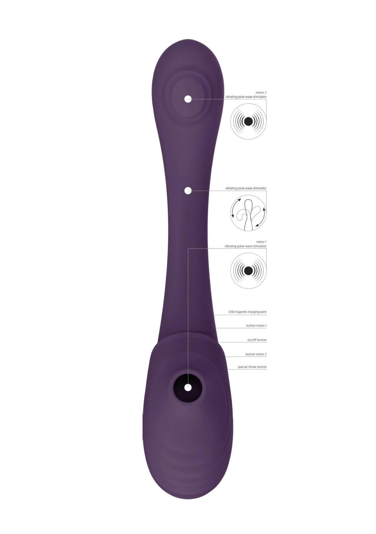 Оснащен 2-мя импульсно-волновыми моторами. Одна сторона вибратора может использоваться для бесконтактной импульсной стимуляции клитора, а другая для мощной стимуляции зоны G. Такой вибратор отлично подойдет и девушкам с повышенной чувствительностью и тем, кто хочет эту чувствительность пробудить.