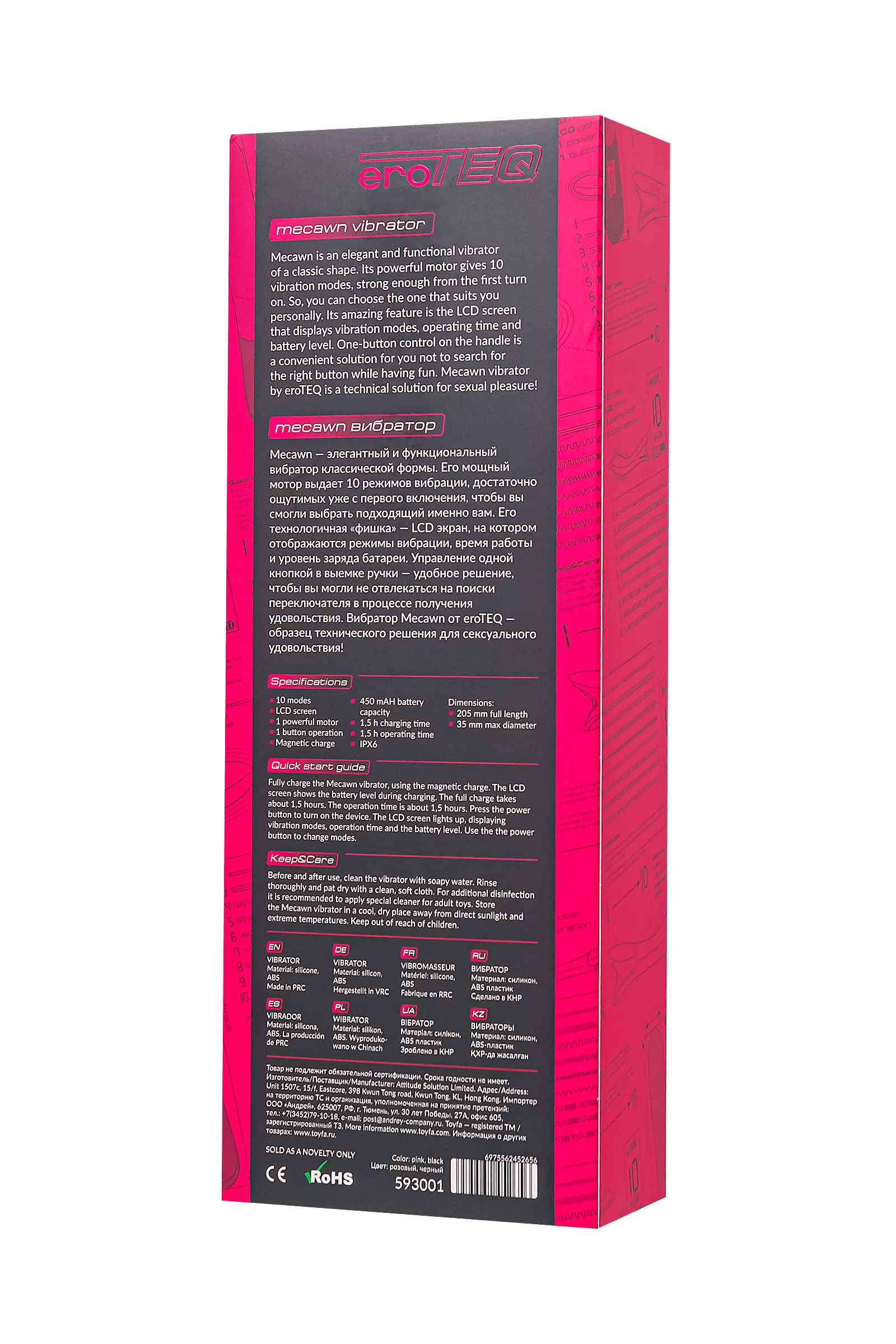 Вибратор Mecawn от eroTEQ – настоящее произведение искусства интимной технологии, гармонично сочетающее элегантность и функциональность. С его естественным изгибом и выразительной головкой, созданными для максимальной стимуляции зоны G, вы окунетесь в мир непередаваемого удовольствия. Длина в 20,5 см и диаметр в 3,5 см обеспечивают идеальное попадание в самое чувствительное место. Гладкая, бесшовная поверхность из высококачественного силикона не только дарит нежность, но и гарантирует абсолютную безопасность при каждом прикосновении. Сочетание соблазнительного розового оттенка и изысканного дизайна приносит удовлетворение и радость! Впечатляйтесь функционалом игрушки даже в душе, благодаря водонепроницаемой технологии IPX6, обеспечивающей простоту в уходе. Рекомендуется использовать лубрикант на водной основе. Mecawn оснащен мощным двигателем и 10 режимами вибрации, каждый из которых продуман для постепенного возбуждения, готовя вас к невероятному оргазму. Мощь этого устройства ощутима уже с первых секунд использования. Революционная концепция Mecawn начинается с LCD экрана, который предоставляет полный контроль над всеми функциями - режимами вибрации, временем работы и уровнем заряда батареи. Управление вибратором – легко и интуитивно понятно, благодаря всего лишь одной кнопке, удобно расположенной в рукоятке. Ничто не отвлечет вас от наслаждения в этом лабиринте сексуальных удовольствий. Mecawn от eroTEQ – это не просто вибратор. Это воплощение новейших технологий в мире сексуального удовольствия! Технические характеристики: 10 мощных режимов LCD-экран 1 мощный мотор 1 кнопка управления Время зарядки 1,5 часа Время работы 1,5 часа Магнитная USB зарядка IPX6