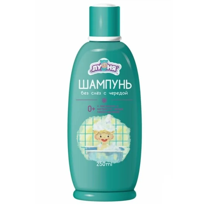 Шампунь “Луня” с чередой разработан для безопасного ухода за волосами малыша. Он не только очищает их, но и питает, делает сильнее.  Экстракт череды стимулирует рост волос, препятствует шелушению кожи, способствует лёгкому расчёсыванию. Пантенол помогает очищению кожи головы от ороговевших клеток. В составе нет парабенов и красителей. При попадании в глаза шампунь не вызывает раздражения.