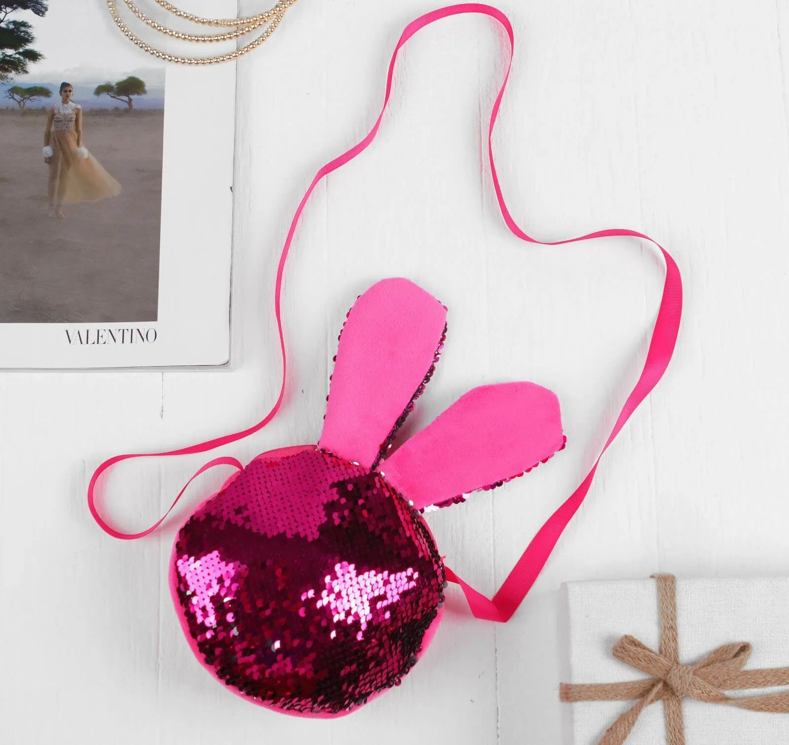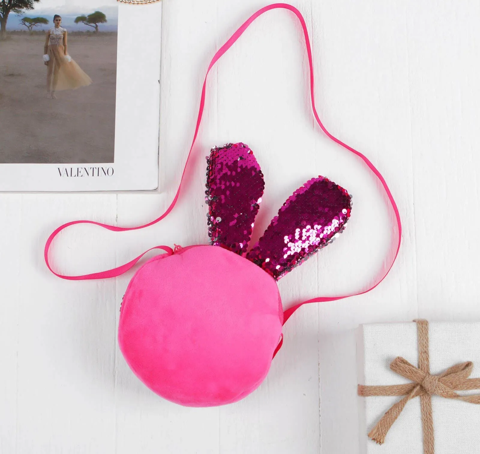 Очаровательная сумочка небольшого размера с длинными заячьими ушками подойдет для хранения и переноски всяких нужных мелочей. Дизайн аксессуара сразу привлекает к себе внимание благодаря блестящим пайеткам розового цвета. Проведите по ним рукой, чтобы они засверкали серебром, переливаясь на свету. У сумочки одно отделение на молнии, длина ремешка не регулируется.